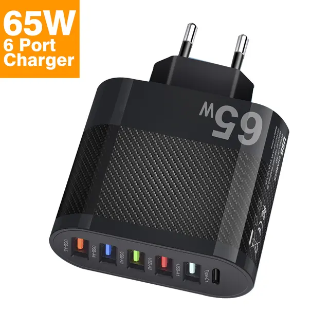 Incarcator retea 6-in-1 65W, 5 porturi USB + 1 port USB-type C, compatibil telefon, laptop, tableta
