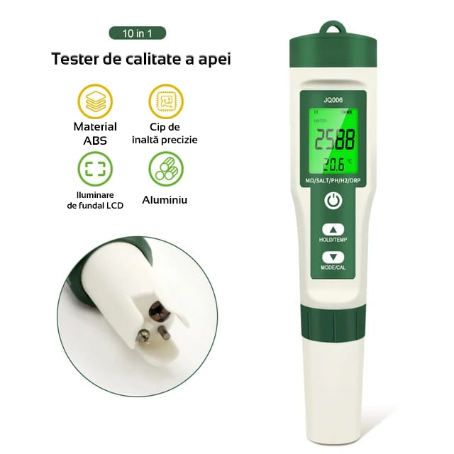 Tester multifunctional de masurare a calitatatii apei 10-in-1 pentru acvarii si piscine, PH TDS EC SALT ORP TEMP S.G H2, rezistivitate, fertilitate, senzor de conductivitate